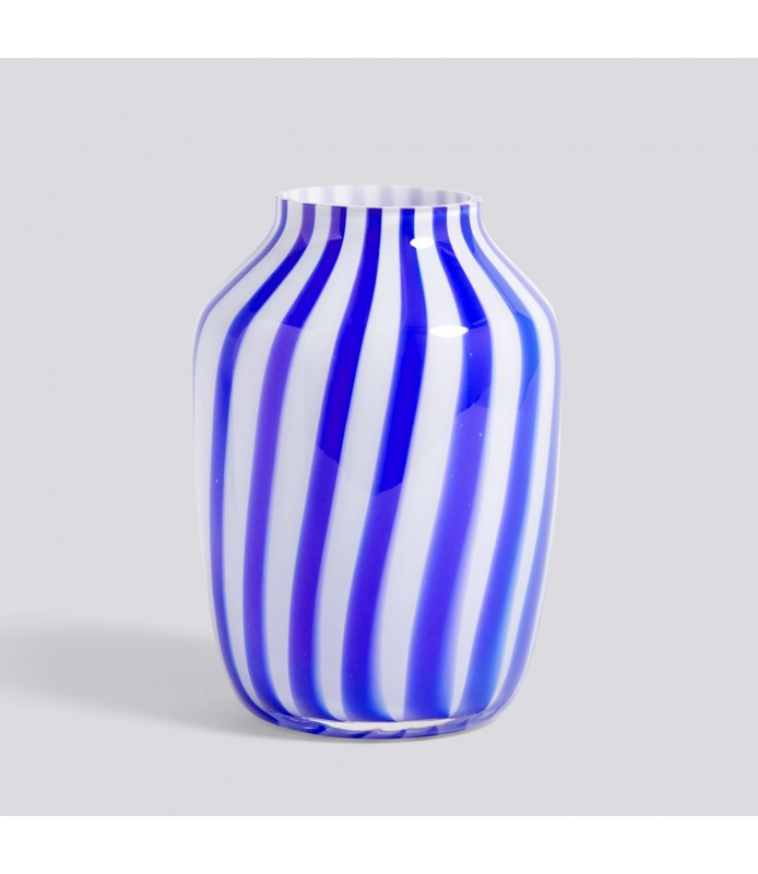 Vertical opaque and clear stripes create a subtle colour variance in Kristine Five Melvar's glass vase collection. Available in two sizes in three different colour combinations.