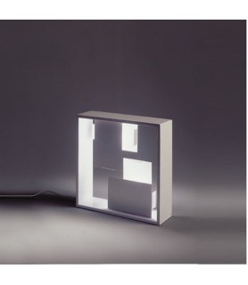 €357.00 €420.00 -15%This table or wall lamp with its geometric metal shades, its plays of light and shadows, empty and full, enclosed in a square frame, is presented as a multi-purpose luminous object: lamp and display case. A luminous sculpture with a strong stylistic connotation typical of the 60s.
