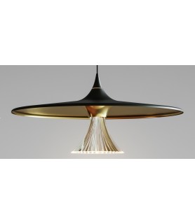 The optic is inserted into a metal disc that extends smoothly in a cone shape towards the suspension point, underlined by a subtle luminous detail.
