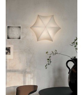 Drawing inspiration from the opulent details found in Baroque art and architecture, the Poem Wall/Ceiling Lamp has a romantic and elegant expression. Made through an intricate process where liquid tissue is sprayed over the lamp's inner steel structure, the result is a translucent shade that artfully stretches over intricate arches, ensuring that the lamp emits a soft, diffused light while resembling a delicate flower. The non-woven polymer shade will beautifully patinate over time, giving it a unique appearance. Hang the Poem lamp on a wall or use it as a plafond-style ceiling lamp that will elevate and illuminate any space.
