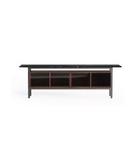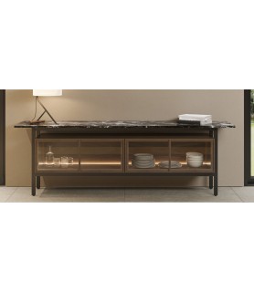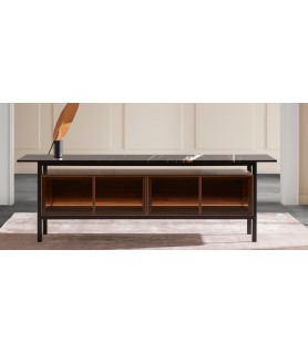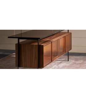 With its light and floating appearance, the sideboard almost looks like a piece of modern architecture. The raised solid steel construction provides stability and structure, while the floating wood cabinet adds a spatial impression. The tabletop that functions as a floating roof with its extended eaves completes the minimalist framework by combining three simple natural materials: wood, steel and stone.