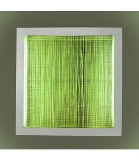 A frame creates a volume of colored light that interacts with the mirrored surface of the background and with the incisions in the transparent front surface that extract the light. In a game of reflections, space stops being one and becomes many or simply something else, an illusory perception of reality that leads to a new place, somewhere else.