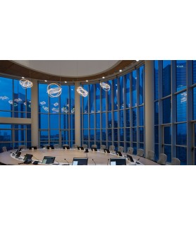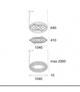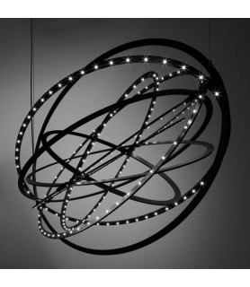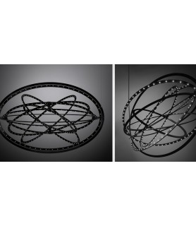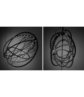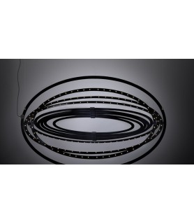 Suspension lamp, matching the wall light. Nine concentric and mobile ellipses, made from a single aluminum plate, serve as the basis for a circuit of 384 white LEDs. The ellipses rotate independently along two different axes, a detail that allows the light beam to be oriented and numerous spatial configurations to be obtained in parallel. When the device is closed it is completely flat.