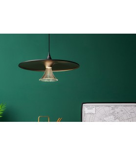 The optic is inserted into a metal disc that extends smoothly in a cone shape towards the suspension point, underlined by a subtle luminous detail.
