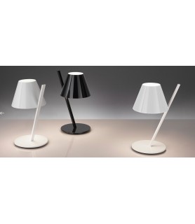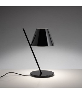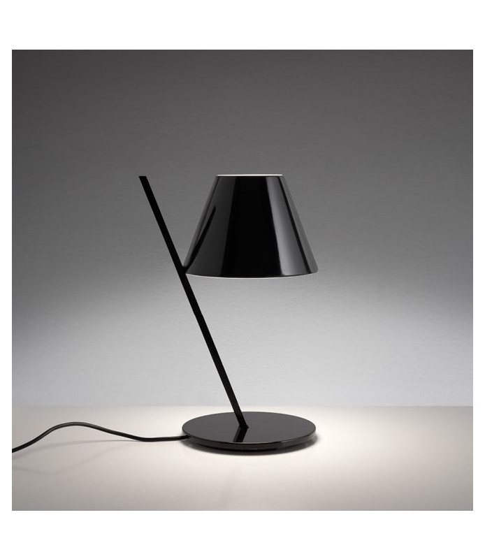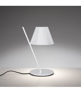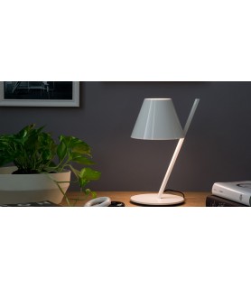 An archetypal lampshade balanced on a tilted stem creates a balanced and elegant geometric composition that surprises despite its simplicity. The screen is a light plastic volume closed by two diffusers that produce soft and pleasant direct and indirect light. The joint holds the screen in a minimal support point connecting it to the aluminum stem.
