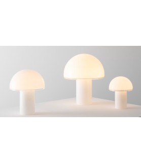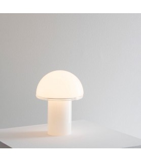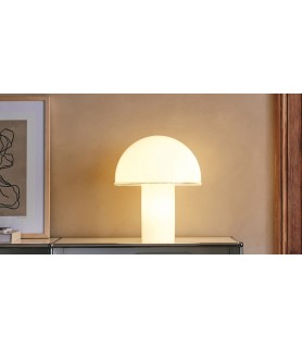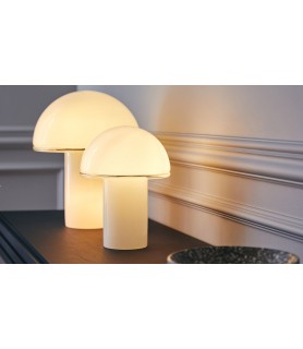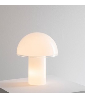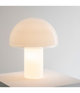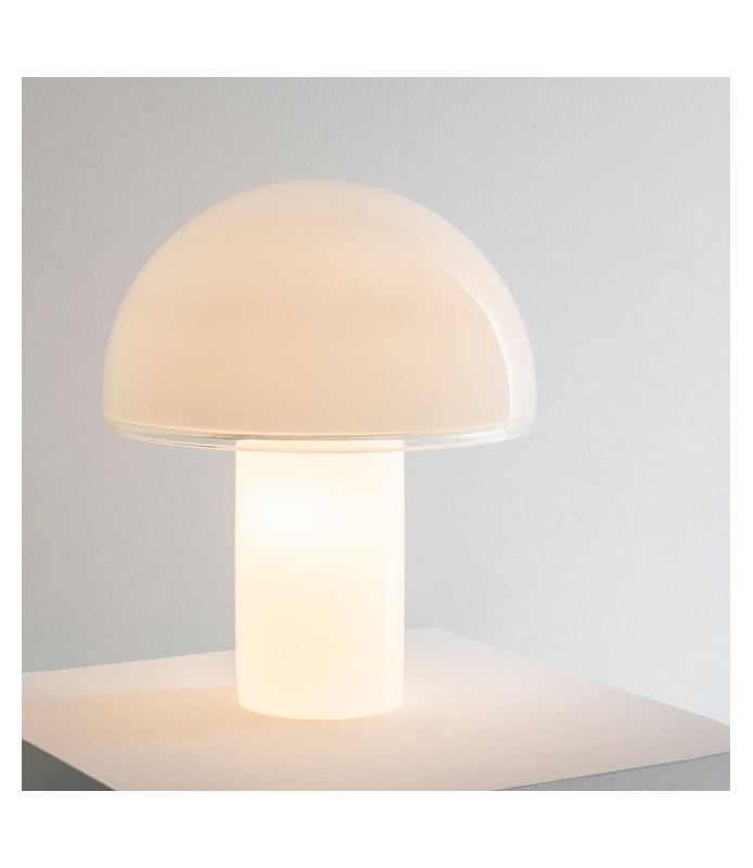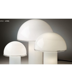 Onfale, diseñada por Luciano Vistosi en 1978, es una obra maestra del diseño que llama la atención de cualquiera que la vea. Su forma sinuosa y redondeada recuerda la forma perfecta de una seta. Viene con un marco de vidrio soplado y un difusor de vidrio opal, proporcionando una iluminación uniforme y encantadora. El borde de vidrio transparente laminado en caliente del difusor acentúa la forma simple, revelando una consumada experiencia en vidriería.