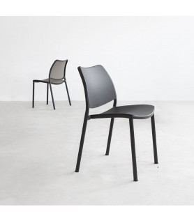 The structure of the chair is made of aluminum finished in gloss or matte chrome. Lacquered in white or black epoxy paint. The seat and backrest can be made of polypropylene or upholstered in fabric and leather. The backrest can be made of textile net.