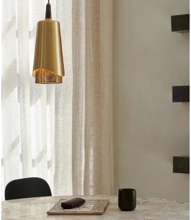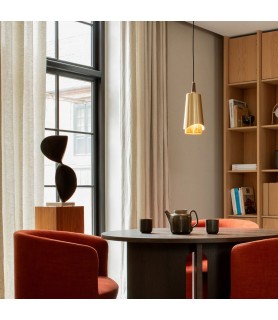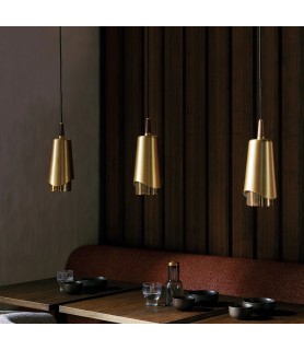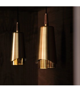 Designed by Arthur Umanoff, this eponymous pendant light shines a light on the contrasts created when perfectly symmetrical, geometric brass and walnut wood components meet. The suspended design emits downward light to illuminate surfaces with its soft and cosy glow.