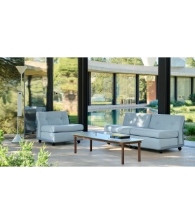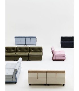 Its modular and customizable system allows for configurations as a single seat or sofas of 2, 3, or 4 units, with a wide choice of premium fabric or leather upholstery.