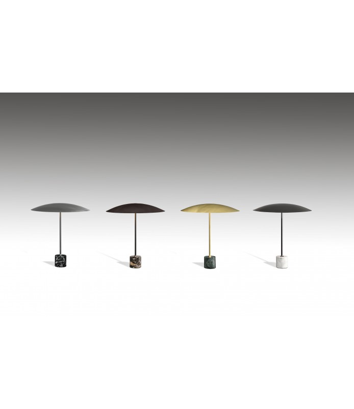 DRUMS design Fambuena Lab 2019 Drums es una colección de sobremesas metálicos decorados en latón, bronce, pewter y níquel negro, combinados con base de mármol en cuatro acabados (blanco, negro, verde y marrón) con un difusor de tubo pírex satinado. La fuente de luz está compuesta por dos bombillas G9 LED con luz cálida.