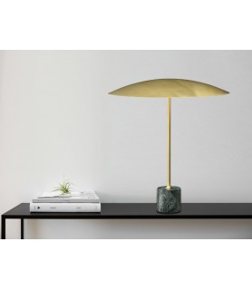 DRUMS design Fambuena Lab 2019 Drums es una colección de sobremesas metálicos decorados en latón, bronce, pewter y níquel negro, combinados con base de mármol en cuatro acabados (blanco, negro, verde y marrón) con un difusor de tubo pírex satinado. La fuente de luz está compuesta por dos bombillas G9 LED con luz cálida.