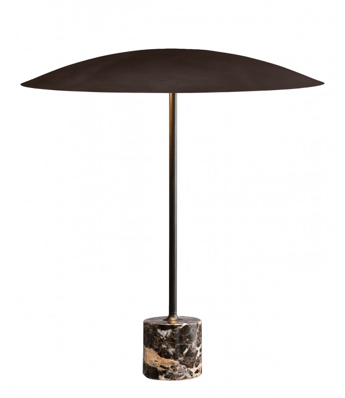 DRUMS design Fambuena Lab 2019 Drums es una colección de sobremesas metálicos decorados en latón, bronce, pewter y níquel negro, combinados con base de mármol en cuatro acabados (blanco, negro, verde y marrón) con un difusor de tubo pírex satinado. La fuente de luz está compuesta por dos bombillas G9 LED con luz cálida.