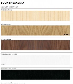 La silla Egoa es ya un clásico del diseño Español de los últimos tiempos. Con más de 20 años en el mercado, la silla Egoa es de una comodidad extraordinaria, pues el respaldo se adapta a la posición de la espalda, acompañando nuestro movimiento. Se logra así una ergonomía dinámica. Pero para conocerla completamente es necesario sentarse en ella. La estructura es de acero cromado. El asiento y respaldo pueden ir tapizados en tela o piel. Las versiones en diferentes maderas naturales pueden ser de fresno, roble o nogal, o lacadas en blanco o negro. La madera es de origen francés de bosques con gestión sostenible. Existe la versión giratoria, con ruedas y pistón para regular la altura.