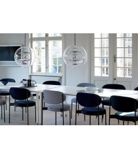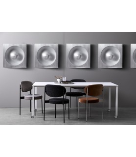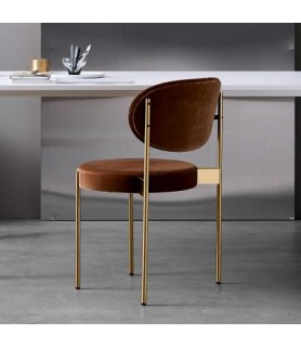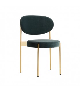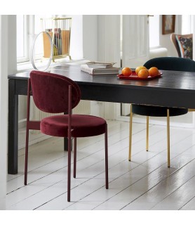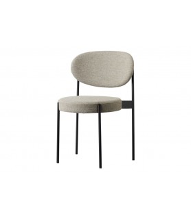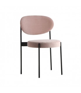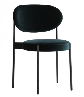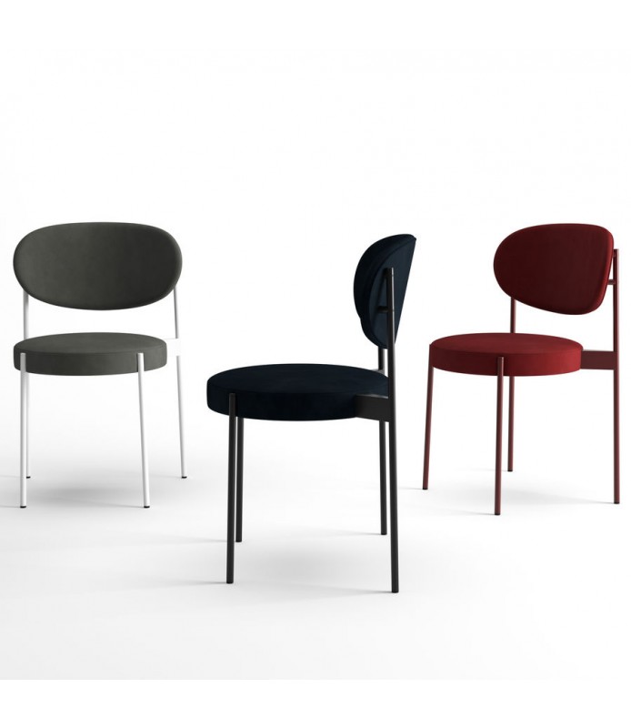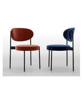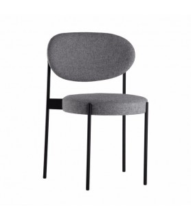 Fully upholstered stacking chair with black, white or burgundy painted metal frame with felt feet.