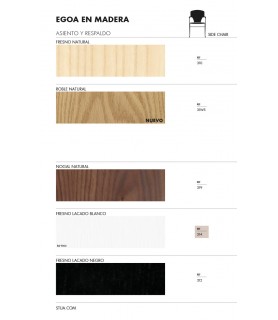 La silla Egoa es ya un clásico del diseño Español de los últimos tiempos. Con más de 20 años en el mercado, la silla Egoa es de una comodidad extraordinaria, pues el respaldo se adapta a la posición de la espalda, acompañando nuestro movimiento. Se logra así una ergonomía dinámica. Pero para conocerla completamente es necesario sentarse en ella. La estructura es de acero cromado. El asiento y respaldo pueden ir tapizados en tela o piel. Las versiones en diferentes maderas naturales pueden ser de fresno, roble o nogal, o lacadas en blanco o negro. La madera es de origen francés de bosques con gestión sostenible.